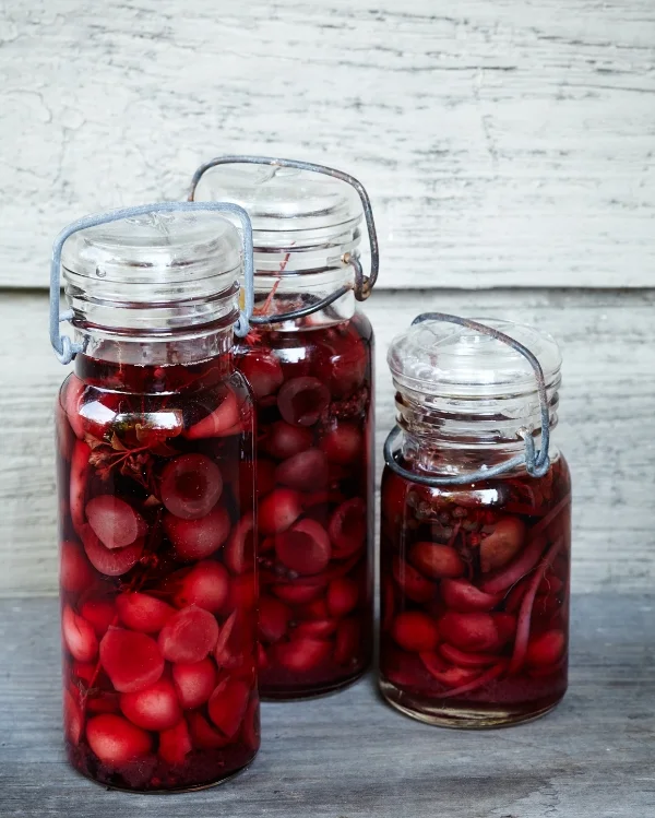 Sterilize two 1 quart canning jars and lids. Set aside. Combine all ingredients except cherries in a large sauce pan and bring liquid to a boil. Reduce heat and simmer about one minute. Pack hot jars with cherries. Divide spices, shallots, garlic and herbs between jars. Pour hot brine over cherries, leaving about 1/4 inch of headspace. Clean rims, cover and process in boiling water for 10 minutes. Pickled cherries will last refrigerated about 1 year.