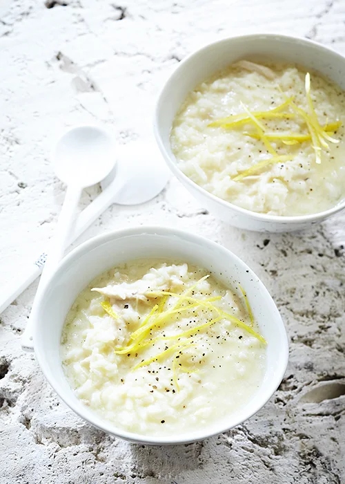Rinse chicken and place in a large stock pot. Add enough cold water to cover by several inches - about 8 cups total. Add onion, carrots, celery, bay leaf and peppercorns. Set over high heat. Bring to a boil and skim off any scum that rises to the surface. Reduce heat and simmer until meat is falling off chicken and stock is rich and golden, about 90 minutes. Remove from heat. Strain liquid into a clean soup pot. There should be about 6 cups of stock. Discard solids and set chicken aside to cool. Strip meat from carcass, shred into small pieces and add to soup pot. Return liquid to heat. Stir in rice. Simmer gently until rice is very tender about 25 minutes. In a clean bowl whisk egg whites just to soft peak. Combine egg yolks and lemon in anotherbowl. Whisk until smooth. Ladle one cup hot liquid into the yolks to temper. Add egg whites, whisk and then pour mixture into soup pot - whisking constantly - to make a velvety smooth soup. Season well with salt and pepper, be sure to keep heat low so not to curdle. Add a touch more lemon juice if desired. Serve hot with lemon zest.